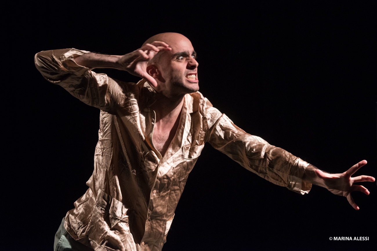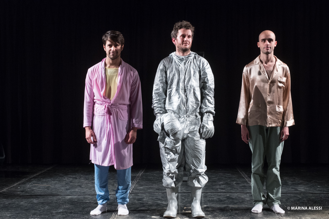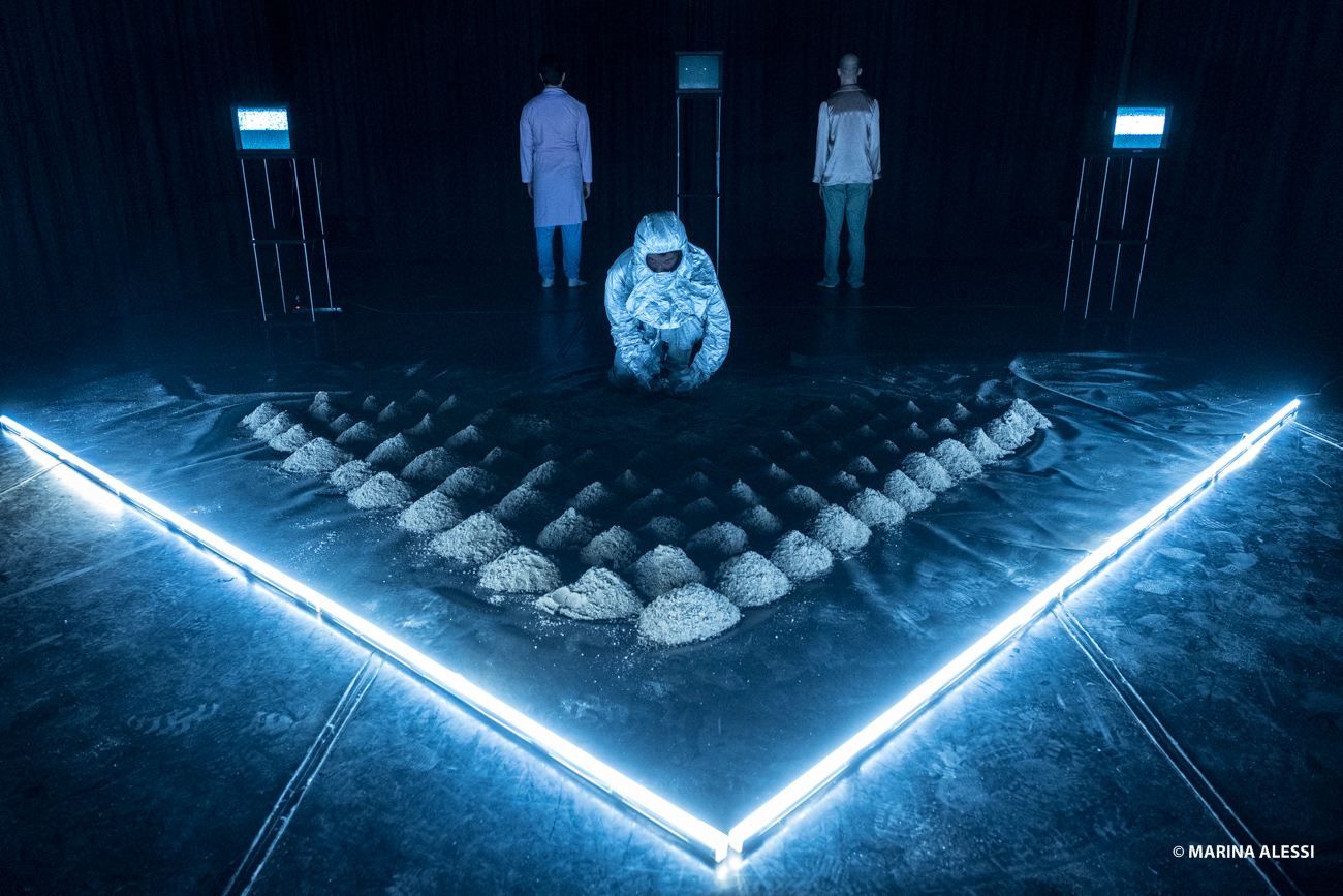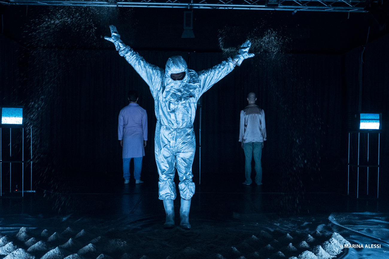A faceless figure orders the fragments of an indescribable image; two friends reflect on their existence after having survived a terrible incident; a man jumps into space in the hope of landing in a better world. The ability to fable stands in this piece as the ultimate refuge of civilization, which faces the only threat to which the human being is not prepared: reality.